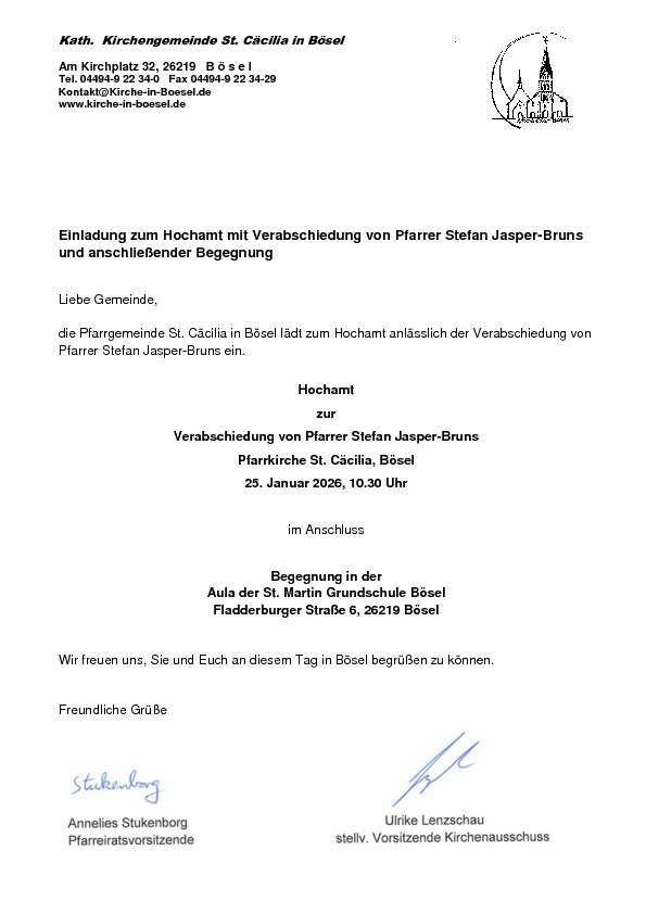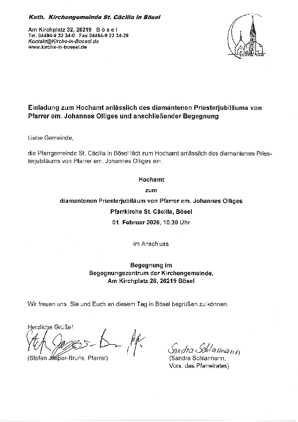 5.12. Vechta, Bösel; Herr Pfarrer Jörn Illenseer wurde mit Wirkung zum 2. Februar 2026 zum Pfarrverwalter für die Katholische Kirchengemeinde St. Cäcilia Bösel ernannt. Illenseer übernimmt die Aufgabe bis zum Amtsantritt eines neuen Pfarrers unter Beibehaltung seiner bisherigen Aufgaben. Der derzeitige Pfarrer der Pfarrei, Stefan Jasper-Bruns, soll zum 22. Februar 2026 in Löningen als neuer Pfarrer der Kirchengemeinde St. Vitus eingeführt werden.